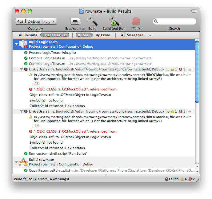 Having confirmed that having built OCMock from its source myself and using that rather than the released version 1.7 hadn’t broken any of the other project configurations led me to discover the next issue. Running the application on my device no longer works!